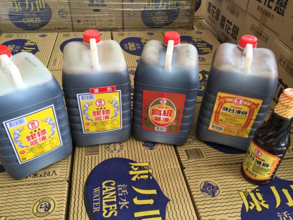 由左至右:味台銀標醬油(6kg)、味台銀標濃色醬油(6kg)、味台高級醬油(6kg)、味台油膏(6kg)、味台油膏 (1000cc),味台秉持純豆麥釀造,歡迎團體訂購,大量訂購本公司提供送貨服務,詢價訂貨電話:03-5680009。