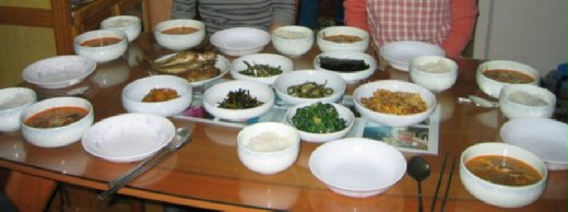 接下來是換穿韓服和拍照。哈韓族在電視上看慣了韓國傳統服裝,沒想到還有機會穿上身。老師指定我們穿什麼顏色和款式,沒有自己選擇的餘地,不過她的眼光算不錯。原來韓服穿起來也有點學問的,雖然沒有日本和服那麼麻煩,可是胸前的飾帶如何打結,手勢如何擺,如何蹲坐地上,左右腳怎麼擺,均有講究。好不容易穿好衣服,擺好姿勢,一一拍照。眾女子嘻嘻哈哈,玩得很開心。老師則忙著張羅午餐。這次活動的壓軸就是家常韓國菜。