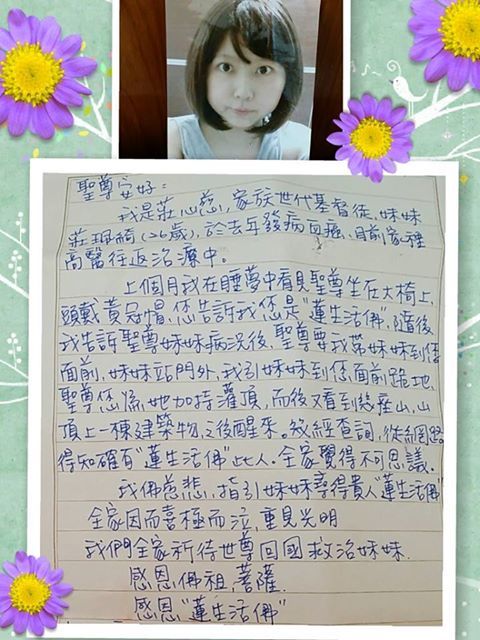 (本報訊/蓮花慧君報導)住在台灣高雄的莊心慈,世代為基督徒家族,一日竟然夢見從未謀面的聖尊,還告訴她為《蓮生活佛》之名,於是她夢中領著聖尊救渡其患血癌的妹妹。