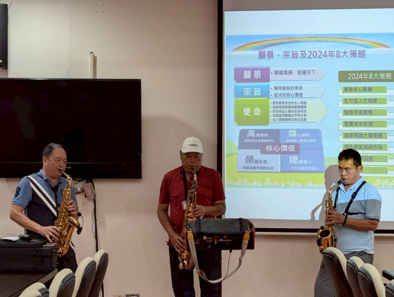 這三位高手因陪同其中一位黃相宏先生每個月來臺中看病,並一起跟著永遠的志工陳樟卿勤練薩克斯風,互相之間的感情因癌更加緊密。(圖二)