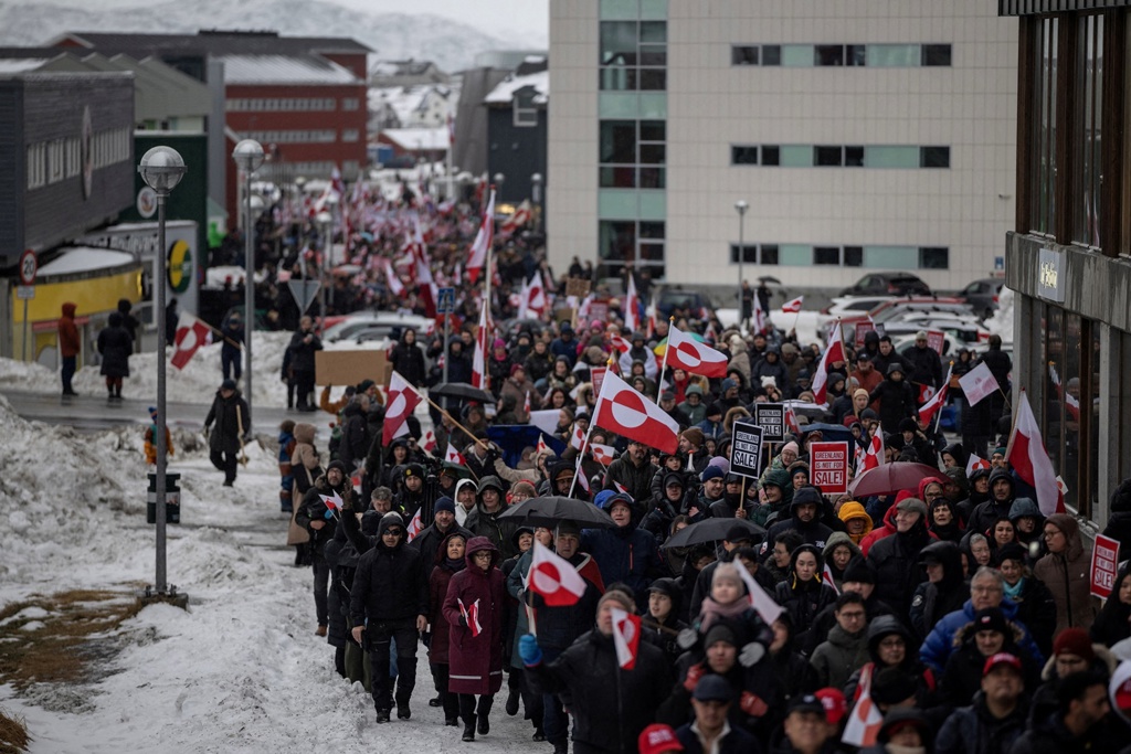 抗議川普的關稅威脅,數千名格陵蘭及丹麥民眾昨日走上格陵蘭首府努克(Nuuk)及丹麥首都哥本哈根示威,抗議群眾舉著「放開格陵蘭」、「格陵蘭島屬於格陵蘭人」、「格陵蘭不賣」等標語,格陵蘭政治人物顏森(Erik Jensen)表示:「我們必須團結,表明格陵蘭不容出售,我們不願成為美國的一部分,也不會被美國兼併。」