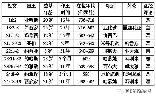 聖經好像並沒有直截了當告訴我們答案。但經文中還是有線索;當聖經作者記載新王登基時,都有一定的格式。——除了寫明他當時幾歲、作王幾年之外,在接下來為他蓋棺論定、評論他是好是壞之前,必先指明他的生母是誰,而且大多連他外祖父的名字也一並記載。請看以下的一覽表------