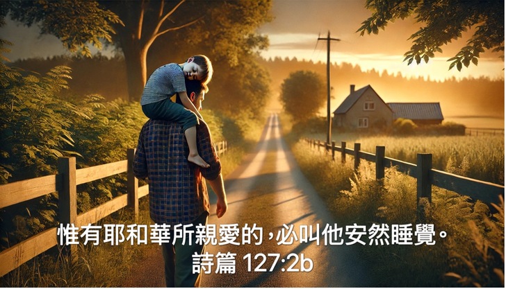 有一張圖,是呼應詩篇裡的一句話:「耶和華所親愛的,必叫他安然睡覺。」一個小男孩,在外面跑了一天,累壞了,坐在爸爸肩膀上,抱著爸爸的頭睡著了,爸爸還繼續往回家的路上走。孩子雖然睡著了,還是在朝著目標前進。希望我們的生活有一天都能到這樣的地步——全心信賴倚靠主,跟著主一直往我們的人生標竿直跑。