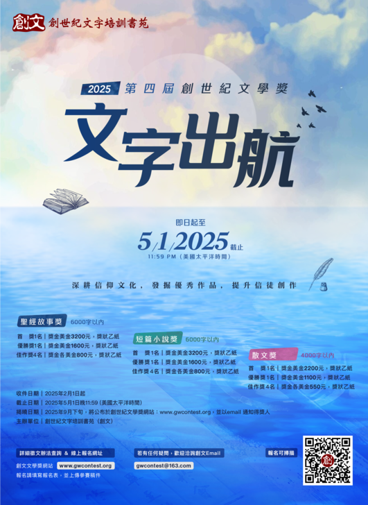 截止:2025年5月1日晚11:59(美國太平洋時間,以在創世紀文學獎網站www.gwcontest.org上傳資料的時間為準),逾期不受理。