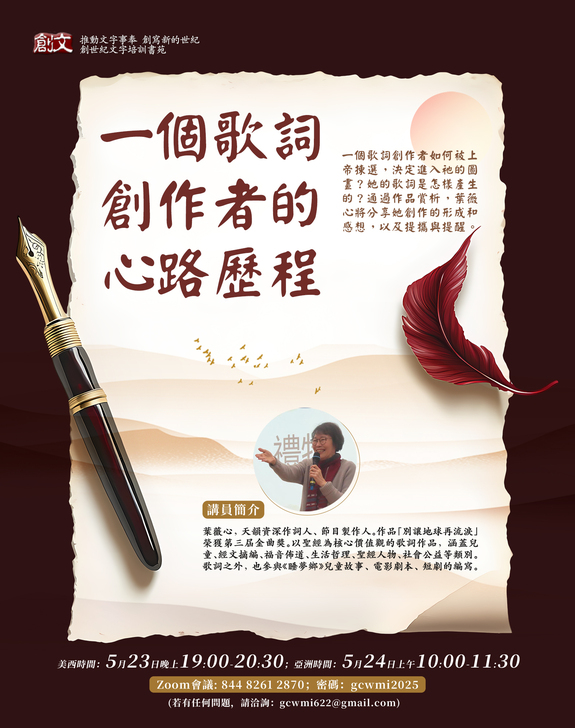 5月24日上午,期待與你雲端相遇,我們一起深入葉薇心老師的詩歌創作旅程,聽她用不同時期的代表作品,探討她寫作的形成與感想,透過歌曲的聆聽與賞析,進入作詞者的內心世界。或許如此,我們也能找到自己內心創作的使命與呼召。