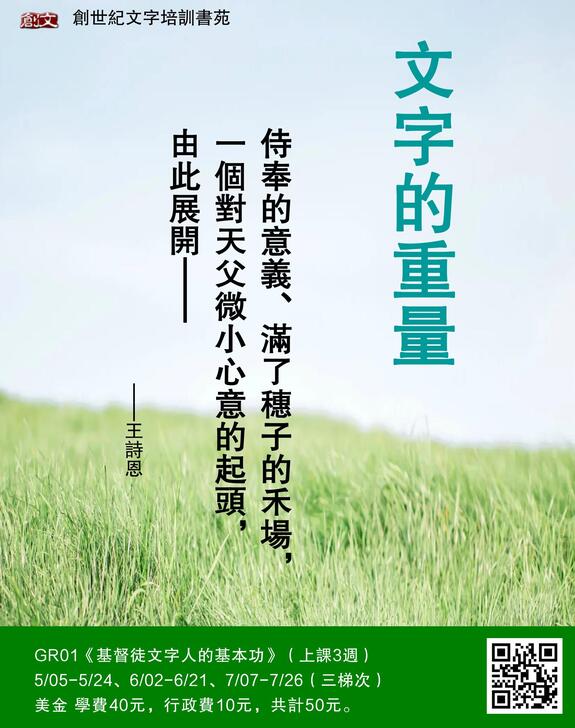 親愛的弟兄姐妹們,不要說「我文筆不行」,不要說「我服侍已經夠忙碌」,不要說「我沒有文字侍奉的呼召」,這些理由都會讓我們把天父賜予的土地拱手讓於世俗文化。這是我們天父的世界,我們都有份於天國文化暢行於地的囑託。