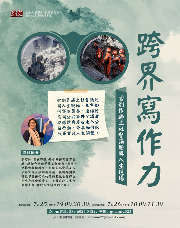 邀請您於亞洲時間7月26日(週六)早上10:00-11:30參加創文雲端直播講座《跨界寫作力:當創作遇上社會議題與人生現場》,聆聽台灣世界展望會會長李紹齡女士分享如何將創作、行動與信仰串聯,讓故事力從紙上走進人心,從理念延伸至世界。