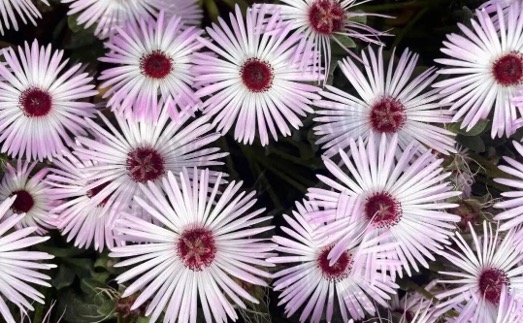 那些花的葉子和莖上布滿了透明、閃亮的水晶球,遠看以為是露珠,在陽光底下彷彿會跳舞。那花瓣薄如綢,多不勝數,呈放射狀恣意舒展,宛如一件被巧手精心裁剪的碎紙太陽;花瓣是嬌嫩的粉,有貝殼內裡最羞赧的光澤,像熔化的琥珀滴落人間。這絕非羞澀的色調,而是大自然用最純粹的顏料,在灰綠色畫布上揮灑出的頌讚。