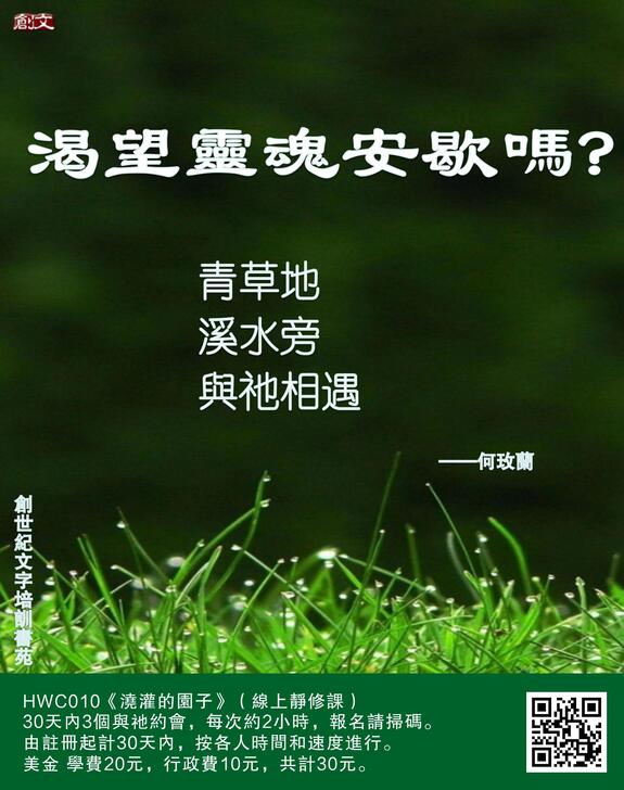 渴望靈魂安歇嗎?青草地,溪水旁,與祂相遇。歡迎查看文末海報,瞭解HWC010《澆灌的園子》(線上靜修課)。