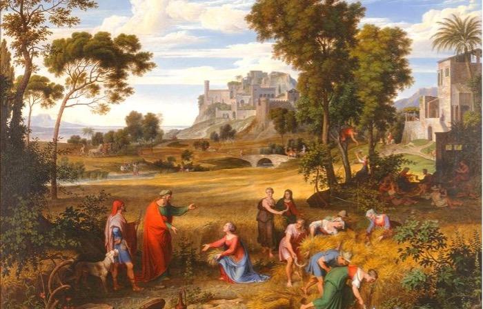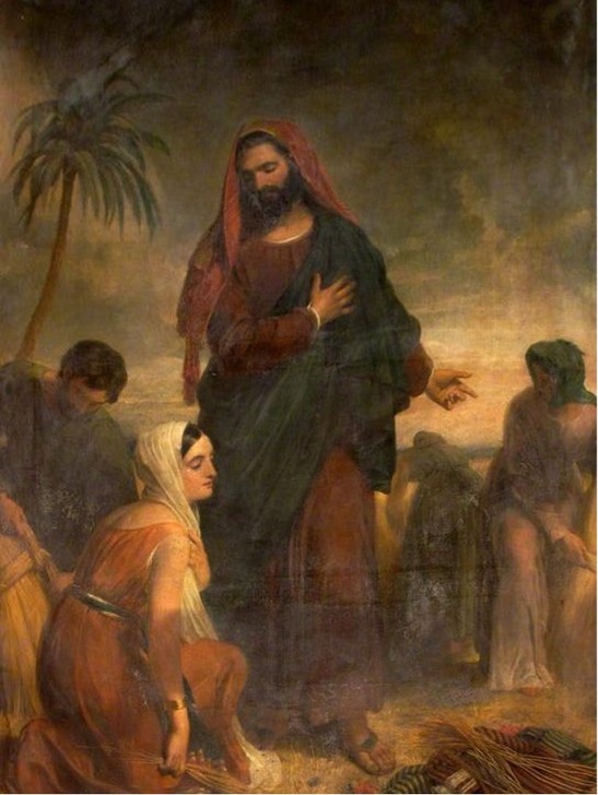 此時女孩挺起腰來,用粗糙的手把一捆捆麥穗抱起。她的臉龐被陽光曬得通紅,陳舊的衣物上滿是汗跡,神情略顯疲態,卻未顯怯懦。女孩抹去額上汗水,聲音平靜卻堅決:「我已經選擇了婆婆,她就是我的家;我投靠的是耶和華,不是人手裡的保障。所以,請你收回這樣的話。」