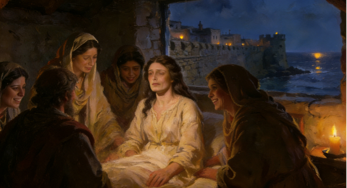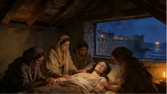 彼得跪下,光線在大比大蒼白的面容上流動,如同針尖悄悄刺破黑暗的寂靜。他握住那雙布滿針繭與細紋的手,低頭禱告:「主啊,您曾使睚魯的女兒復活......如今,我們將這位愛您的女徒,廣行善事、多施周濟的大比大,希臘婦女口中的多加姐妹,交托在您手中。願您彰顯大能,讓眾人見證您的榮耀奉主耶穌名,阿們!」