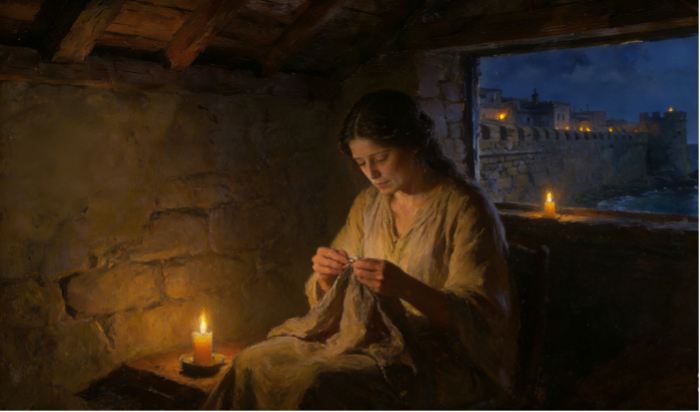 木窗緊閉,海風吹不進來,只有微光滲入縫隙,映照孤獨的身影。她仍坐在原處,執著於手中的針線,好似這樣就能縫補破碎的心。