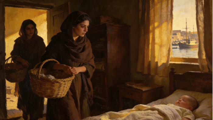 大比大坐在油燈下,針線在指間穿梭,為鄰居寡婦利亞縫製外袍。寒意漸起,利亞的衣服破舊。大比大不時瞥向門外,丈夫約拿單十日前應歸,卻杳無音訊。