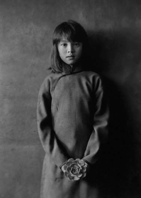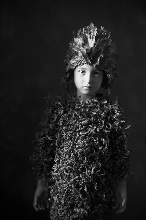 比如那張最初借《生活月刊》封面進入公眾視野的《預備著的童女》,它曾以清澈而安寧的力量讓雜誌編輯落淚,也深深擊中了我。馮君藍自言靈感來自《城南舊事》裡的小英子——畫中的女孩身著民國粗布裙,齊劉海下雙眼明亮,靜靜望向鏡頭,神情中透出一種超越年齡的成熟與內在的安穩。那一刻,彷彿能透過她的面容,瞥見被神光映照的靈魂本真。原來肖像可以如此逼近靈魂的本來面貌,無須言語,無須象徵,只要足夠的虔誠與凝視,尋常之人便也成了光的載體。