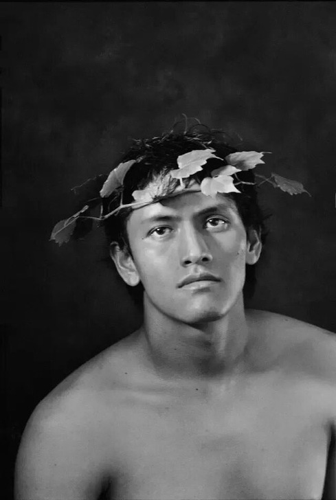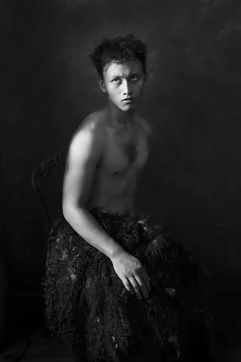 那是一個並不起眼的展位,牆上只掛著寥寥幾幅黑白肖像。周遭的聲浪彷彿驟然退潮。我看見其中一張:一個男子頭戴藤蔓編織的冠,光線從側面落下,照亮他深邃的眉眼。他像是從遙遠的時空裡走來,卻如此沉靜地凝視著此刻。我的呼吸停頓了一下——所有嘈雜似乎都被一道無聲的屏障隔開,只剩下一種異常的、幾乎可觸摸的寧靜。