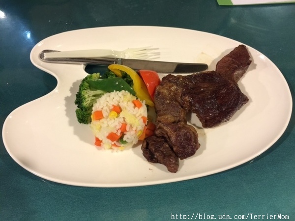 晚上回度假山莊帶著狗狗去吃晚餐,因為要帶她們一起,所以坐戶外。我訂的價錢每個房間可帶ㄧ隻狗,且附一份寵物晚餐。多帶一隻加$800但不包餐,含晚餐要$1,200。我覺得狗狗一餐要$400太貴,我就沒加餐,所以帶了一些雞肉乾準備讓她們分著吃。但等寵物餐送上來時,發現份量十足,很大一塊牛排,也有青菜和米飯,我們家兩隻小狗分綽綽有餘,帶去的雞肉乾就用不上了。餐廳的員工對狗狗也非常友善,這是值得嘉許的地方。