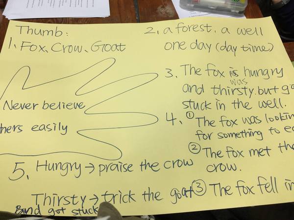 Graphic Organizers為藉由圖像化結構來帶領學生分析英文閱讀文本。為了讓我們能直接體驗此教學法,同上段所提及,老師先讓我們找自己的朋友每四人一組,每組必須先閱讀一篇短文(from Aesop's Fable),在閱讀完之後,各組拿到一張海報,而老師在投影幕上秀出一個格式,學生必須依照他的格式(或自己做點變化亦可接受)將其畫在海報上(如下圖所示),主要的目的即是希望學生能在閱讀完文章後,透過簡單的表格整理,回答出關於文章的問題,除了有助於確認學生是否理解文章外,亦可幫助學生了解文章重點與脈絡。根據下圖,我們可以看到學生必須回答的項目包括:主要角色、時間、地點、角色所遇到的問題以及牠如何解決問題,最後亦包含從此則寓言故事當中學生自我所得到的啟示為何。而下圖這個表格即為本日重點之一的Graphic Organizers,跳脫單一僅有題目的考卷或學習單,以畫報結合圖表呈現能增加對學生的吸引力。值得注意的是,在設計不同的GOs(Graphic Organizers)時,可以運用主題包裝來呈現要教的內容,像是下圖所運用的主題即為手掌,而各個回答的列點則分別為不同手指的名稱。