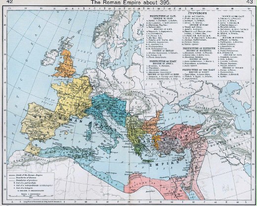 77. 皇帝君士坦丁(Constantine)於西元330年將首都遷往博斯普魯斯沿岸的拜占廷為新都,並改名為君士坦丁堡。 395年,皇帝狄奧西一世(Theodosius I)逝世,東、西兩帝國正式分裂。 此後羅馬帝國的政治實體 : 東羅馬,西羅馬;虛名 : 查理曼羅馬,神聖羅馬,帝三羅馬;在歐洲大陸飄盪了十五世紀!!