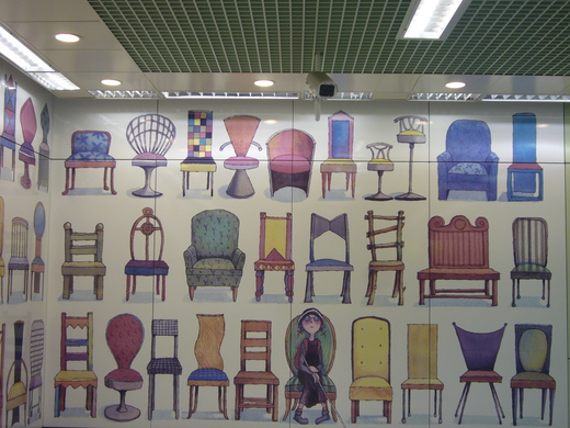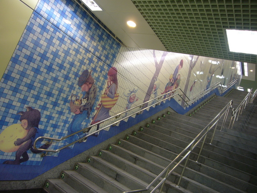 入口樓梯處的「地下鐵」分別有<向左走向右走>的男女主角、<森林裡的秘密>的毛毛兔、<月亮忘記了>的獸裝小孩、<失樂園>的叉叉熊、<微笑的魚>和<小蝴蝶小披風>等場景串成,十足震撼的視覺效果。