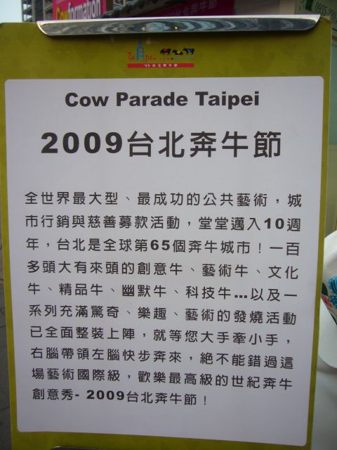 (CowParade) 「奔牛節」是全球最大的公共藝術交流,從最早1998年於蘇黎士所創、1999年美國芝加哥(Chicago)、2000年的紐約(New York),到2001年的美國堪薩斯市(Kansas City)及2002年的休斯頓(Houston),奔牛節一直在進化中,不只在造型牛的尺寸,也在創意與藝術的品質。因為對創作者來說,過去所累積的牛造型創作也使得創作挑戰也愈來愈大。當然,每個地區或城市的在地藝術家們也會受到在地文化的影響,使的牛造型創作的詮釋而因此不同,這也是奔牛節在全球各地都能引起話題與風潮的關鍵。到2007為止,全球已有60餘個城市舉辦過奔牛節活動,台北將是第65個奔牛城市。
