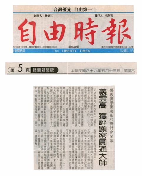 2.【義雲高大師 系列新聞報導】-2000年05月13日– 「2000.05.06佛教佛學佛法正邪研討會」一致公認義雲高大師為顯密圓通、五明俱足的大法王正宗佛教大師