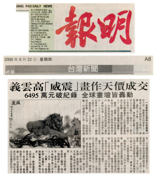5.【義雲高大師系列新聞報導】-2000年06月22日– 義雲高「威震」畫作天價成交 6495萬元破紀錄 全球畫壇皆轟動 (明報 2000年6月22日 星期四 台灣新聞 A8)