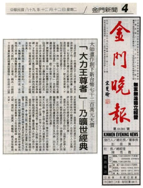 6.【義雲高大師 系列新聞報導】-2000年11月27日– 大師畫作創下新台幣七千二百萬元天價「大力王尊者」-乃曠世經典