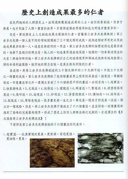 H.H.第三世多杰羌佛的书画种类包括中国画、油画、书法等,而H.H.第三世多杰羌佛的中国画,论题材,无论是山水、花鸟、走兽、鱼虫、人物……论技法,不管是工笔、写意、泼墨……无所不通,无所不精,无一不是有真实的传统功夫而创新的神意。H.H.第三世多杰羌佛除了能够绘画世界上现有的具象派、抽象派、笔划线条派、印象画派等之外,还独立首创了十六个与众不同的画派,并且将每一派种画风都推到了高峰的完美艺术境界,形成了历史上任何画家都无法与之比拟的、自成独立的「多元风格第三世多杰羌佛流派」!