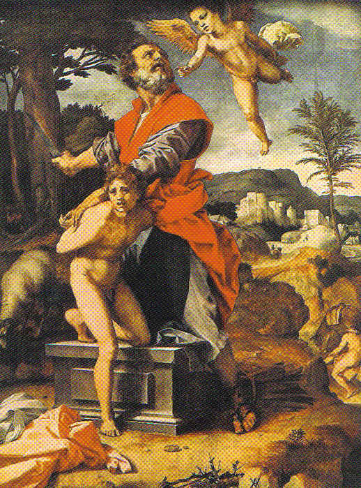 父與子的談話之間,不知不覺的,他們就走到了耶和華指定的地點。亞伯拉罕親自築好起祭壇,並且把柴堆好;然後抓起十分惊愕的以撒,將他捆綁起來放在祭壇的柴堆上,痛苦的舉起手,將刀出銷,準備殺子祭祀神。