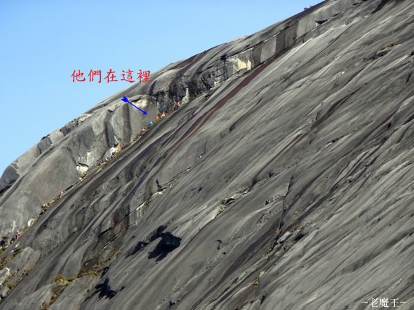 我往上爬去, 看到許多人擠在山頂, 便先在離山頂約 15 公尺處坐下來. 從出發走到這兒, 花了大約 2 小時 40 分鐘. 3 分鐘後, 鐵人夫婦從山頂走下來, 鐵人說 "你上去拍照了沒?" 我說 "不是要等大家都到了, 拍大合照嗎?" 他說 "先上去拍獨照啦, 否則等一下人會越來越多!"