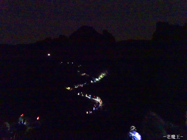 這一段山路是 2.5 公里長, 要上升 800 公尺左右, 相當陡. 大夥兒在黑暗中一路往上爬, 我在慢慢行走當中, 陸續追趕過一些人, 這才發現, 我可能是我們這一隊最後一個出發的, 因為我居然連續趕過好幾位認識的夥伴!?