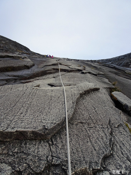 這一段山路, 剛剛在黑夜中爬上來時, 只覺得好累好喘, 現在看過去, 有一種 "一望無際" 的遼闊! 我們就是順著繩索爬上來的, 如今視野分明, 卻也不敢造次亂走, 還是順著繩索下山.