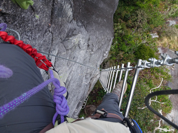 接著要爬一段鐵梯, 這就比較累了, 因為是垂直上升, 腿力和臂力都要用到. 昨天解說員有說, 在這段梯子上可以搖擺. 但當我搖動時, 發哥立刻很緊張, 停在我上面不動了. 於是我只好靜止下來, 等他換到另一面山壁上的階梯時, 我這才自己搖晃了一下, 然後爬上去. (結果發現, 根本晃不動, 沒有搖擺的快感)
