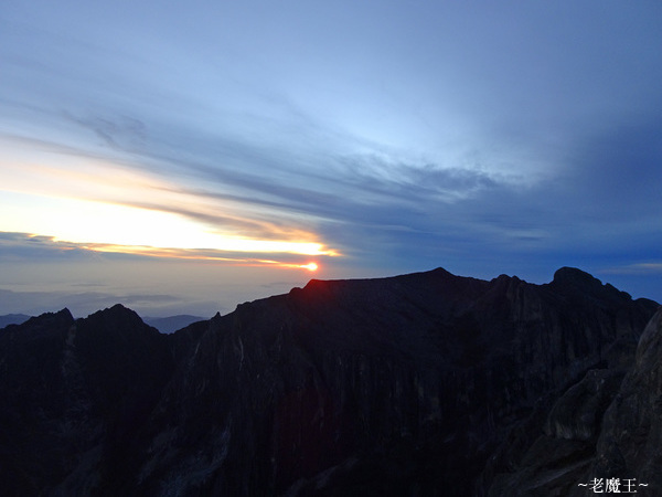 不久, 全員到齊, 由於山頂的位置太小, 所以我們拍完獨照後, 便來到峰頂下 15 米的地方, 以南峰當背景來拍大合照. 此時太陽金光照在南峰上, 頗有歐洲馬特洪峰的味道呢!