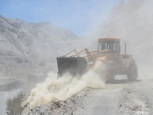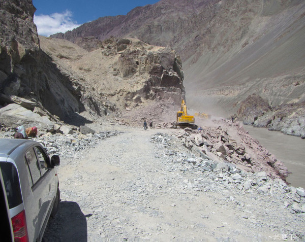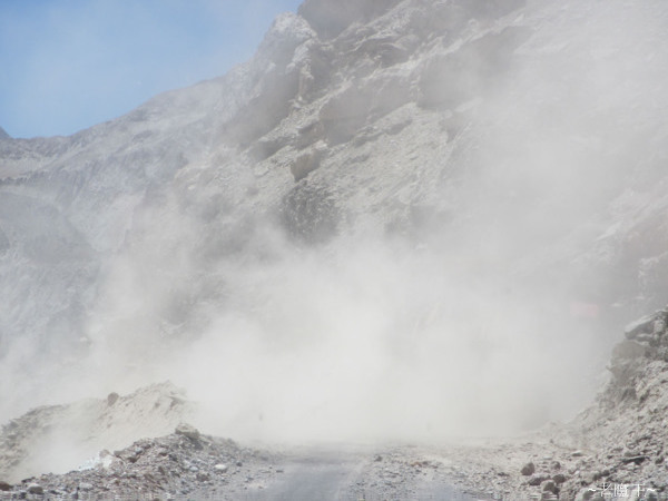 接下來的道路一直順著 Zansker 溪蜿蜒盤旋, 有時平順, 有時顛簸. 不久, 看到前面一團煙霧, 且有隆隆聲, 像是剛剛山崩過!?