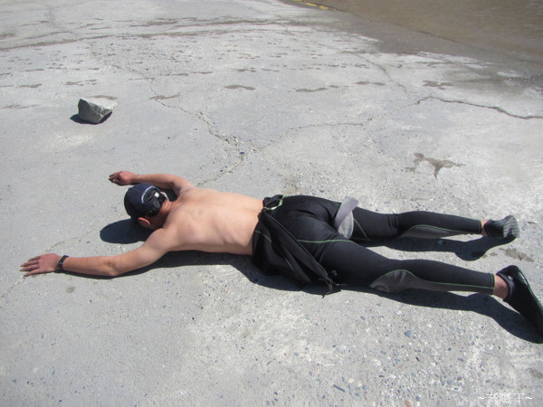 此刻不宜多想, 因為還是很冷. 奮力把船划向終點後, 一上岸, 第一件事就是脫下冰冷的防寒衣, 躺到地上取熱. 暖和個一分鐘後, 再翻身煎另一面!
