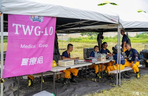 管理組先架好指揮站 (ICP, Incident Command Post), 後勤組搭好管制站; 我們醫療組會有 8 頂帳棚, 但為了搶時間, 先搭好兩頂行政帳及一頂醫療帳後, 就通知搜救二組 (簡稱搜二) 前來做 "出隊前的健康檢查".