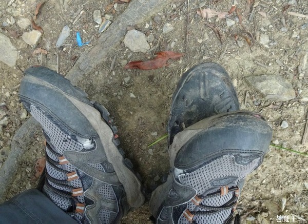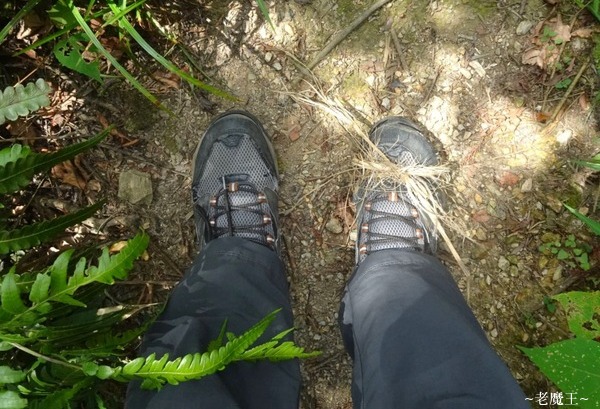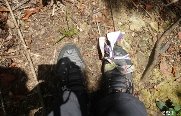 從第一岔路口開始往上的這一段天堂路, 只有在 3.4 K 處, 有大約 20 公尺左右的平路, 接下來又是一直陡坡向上. 我直走到 2.75K 處, 來到第二岔路口, 才終於看到有往下的木板棧道 (從這兒開始, 是新舊寮的稜線, 會一路下到舊寮瀑布). 坐下來喝水時, 發現我的登山鞋已經明顯開花了!!