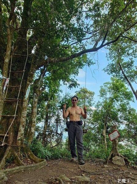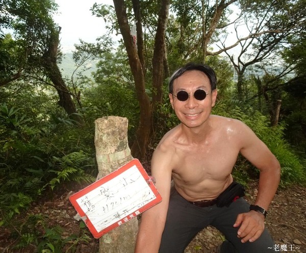 此時太熱了, 我把上衣脫掉, 灌了幾口運動飲料; 看看指示牌, 從這兒爬到舊寮山的三角點, 只有 400 公尺. 我盤算了一下, 決定只帶相機上去, 把背包和上衣都放在這兒, 就這麼打赤膊去登頂.