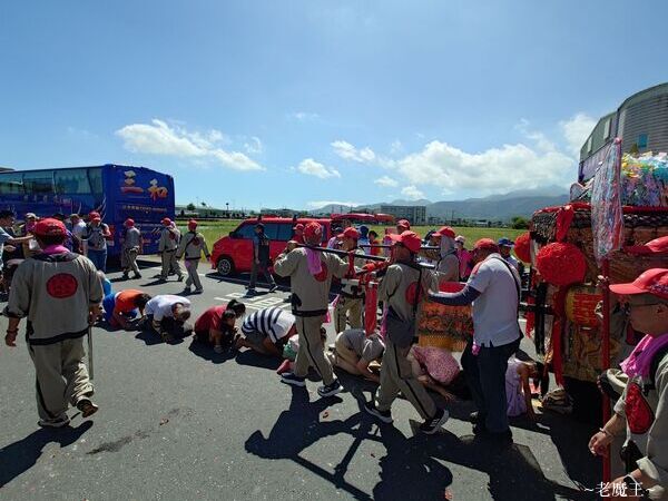 此時非常炎熱, 地面溫度至少有 40 度C, 但還是有許多信眾跪在地上, 等著鑽轎.