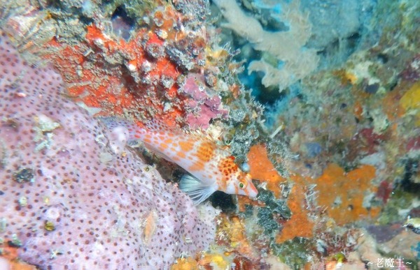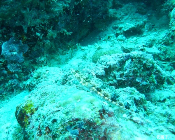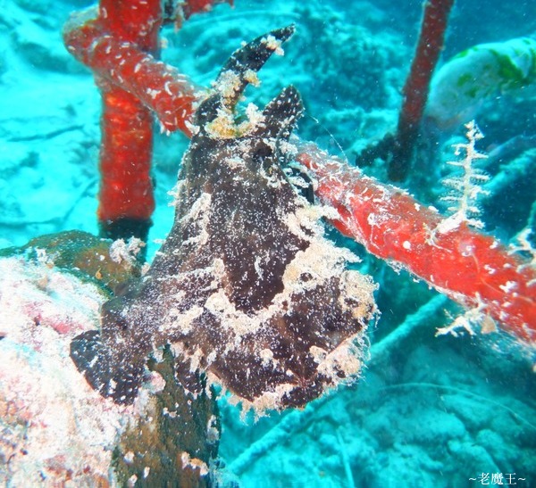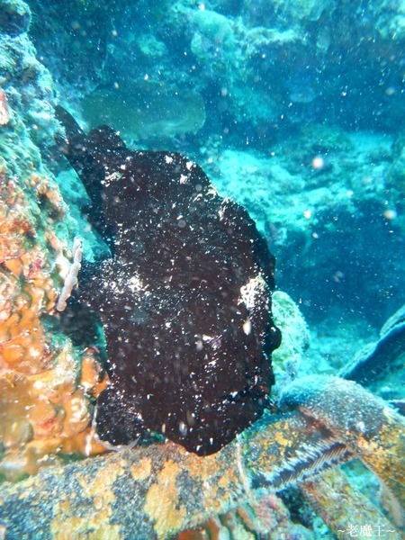 我們穿好裝備, 游過大約 50 公尺遠的潮間帶, 到了海下峭壁時, 一下沉, 便在螃蟹船的纜繩上看到一隻黑漆漆的躄魚.