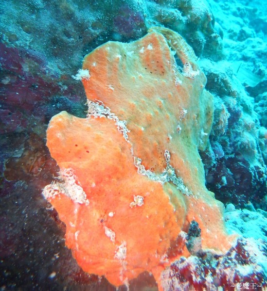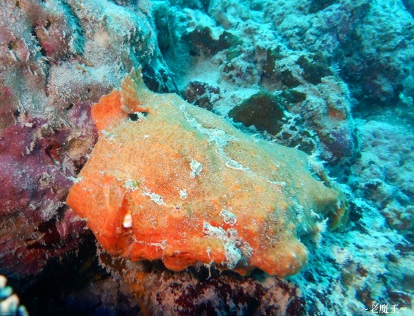 有一隻橘色的躄魚居然是橫躺著, 在這張照片中, 牠是左側躺, 腳鰭在左邊, 嘴巴微張, 敢情是睡到嘴開開嗎?