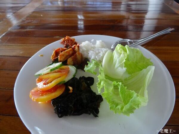 他們決定幫我們把裝備載到北邊 150 公尺左右的潛點, 我們則自己走路過去, 今天就再去看一次沙丁魚風暴吧. (渡假村的泡菜滿好吃的, 而且很下飯, 包在美生菜裡吃也很對味)