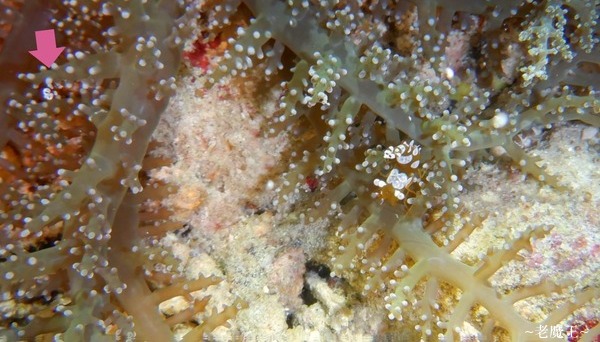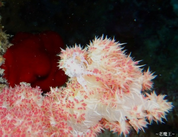 我原以為這棘穗軟珊瑚上只有一隻蝦子, 後來聽說小妤把兩隻蝦子送作堆來拍照, 我回頭再看我的照片, 才發現真的有兩隻蝦子.