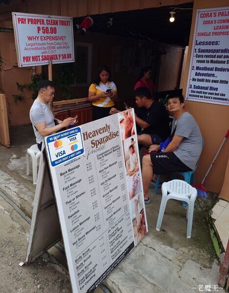 豆桑和阿仁前天下午去按摩, 聽說滿貴的, 而且環境不好, 手法又普通. 今天我們 6 個人去, 我說 "這裡的按摩功力可能都差不多, 就找個便宜一點的吧." 挑了一家比別家便宜 50 peso 的店, 接待員說我們一次 6 個人, 這邊空間不夠, 要找人載我們到分店去.