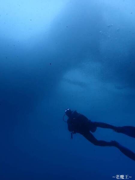 Alex 簡報過後, 我們從東面下水. 這兒的洋流稍微強了些, 大家一下水, 先抓住繩索穩定; 等夥伴們到齊後, 再一齊下沉. 一下去, 先在一個混濁的岩洞裡看到一隻火焰貝.