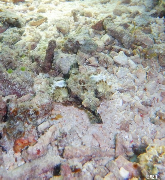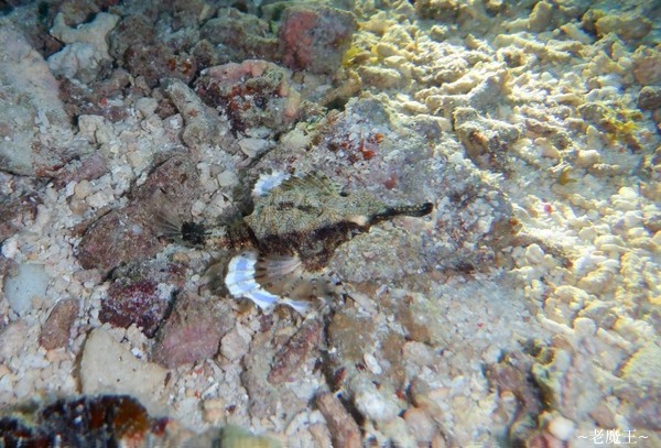 減壓時間過了, 我們來到小島的西北面下水. 這裡的水依舊相當濁, 但還是一下水就看到一隻很大隻的灰白色躄魚. (可能是打光的關係, 小兔拍起來是橘色的)