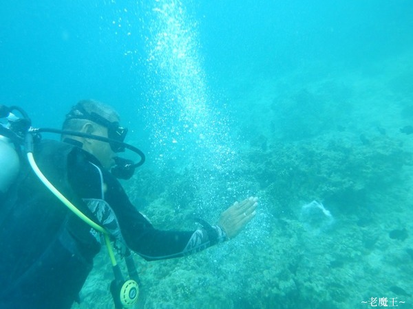 這裡有許多熱帶魚, 但是水好濁, Alex 帶大家順著峭壁的邊緣游走. 不知道是誰的蛙鞋, 踢翻了這一叢海葵. 我看那隻小丑魚一臉愕然地停頓了一下, 牠可能正在罵三字經 "X, 是誰把我家給踢翻了?" 哈哈!