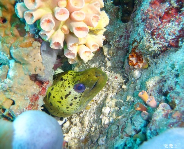 我拍完後, 剛好丁游過來, 我便指給她看; 後來她正要對焦時, 鰻魚就游走了, 原來是正要遷徙離開, 才會這麼大辣辣地全身都游出岩洞.