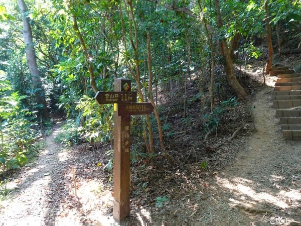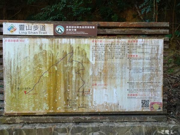 最後的 160 公尺, 安插了木板擋土, 顯然在雨天時, 這一段路一定很滑溜. 我花了 28 分鐘登頂, 來到標高 389 公尺的靈山.